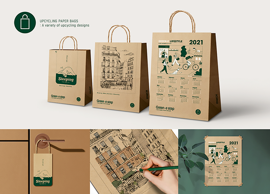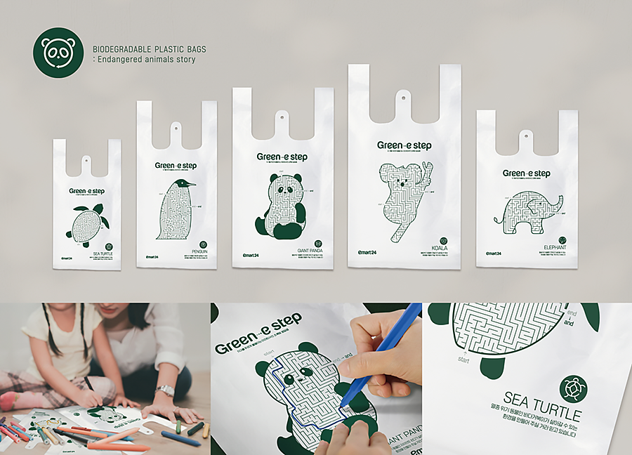 이마트24는 현재 실제 매장에서 사용하고 있는 종이 쇼핑봉투에 ▲‘수면 중(Sleeping)’ 문걸이로 새 활용 ▲개인의 개성에 맞게 색칠해서 새 활용 ▲달력으로 새 활용 할 수 있는 업사이클링 아이디어를 담았다. 또한 현재 검토중인 친환경 비닐 쇼핑봉투에는 멸종 위기 동물을 형상화한 미로 찾기 그래픽으로 동물들과 함께 공존 할 수 있는 길을 함께 생각해 보자는 의미를 담았다.