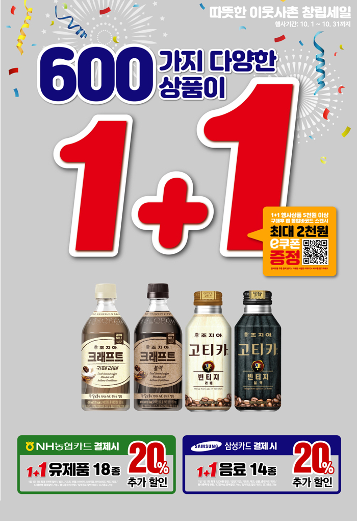 다양한 결제 카드와 손잡고 행사상품 추가 할인 혜택도 제공한다. 10월 한 달간 1+1을 진행중인 음료 14종을 삼성카드로, 유제품 18종을 NH농협카드로 결제 시 20% 할인 혜택을 제공한다. 예컨데 펩시콜라캔(330ml, 1400원)의 경우 10월 한 달간 1+1 행사를 통해 2개 1400원에 구매가능하며, 삼성카드로 결제 시 20% 할인된 1120원이다. 개당 560원 꼴로 60% 할인된 가격에 구매할 수 있는 것.