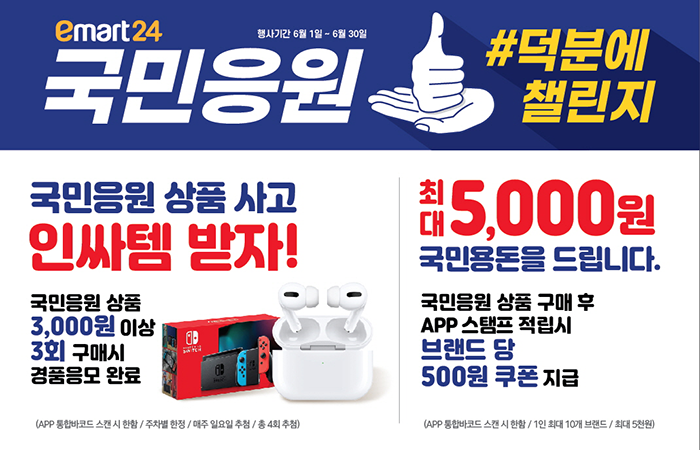 고객들에게 행운을 선사하는 경품 이벤트와 알뜰 쇼핑을 돕는 현금쿠폰 이벤트도 진행한다. 이마트24는 당첨 고객에게 선물할 에어팟프로30개, 닌텐도60개, 스타벅스 아메리카노 쿠폰 4천개를 준비하고, 6월 한 달간 주 단위로 4번에 걸친 경품 추첨을 진행한다.