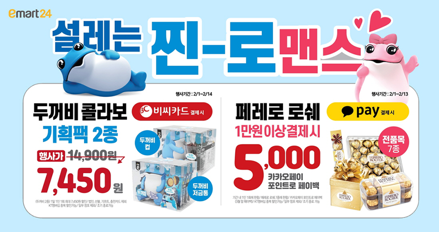 두꺼비 굿즈 기획상품 외에도 초콜릿, 젤리, 캔디 행사 상품을 지난 해 2월 대비 40% 늘린 130여종을 선정해 1+1, 2+1 덤 증정행사를 진행한다. 또한, 카카오페이로 페레로로쉐 전 품목(7종)을 1만원 이상 결제 시 5천원을 카카오페이 포인트로 페이백 하는 행사도 이달 13일까지 진행한다. 이마트24가 밸런타인데이 행사에서 페레로로쉐 전 상품을 할인하는 것은 이번이 처음이다.