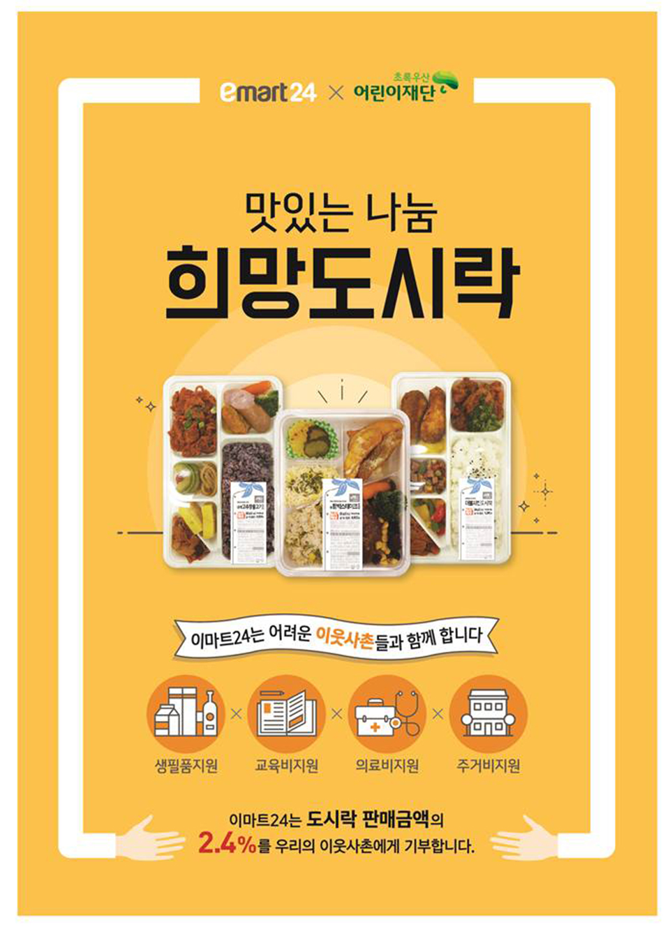 이마트24는 도시락 전 상품에 희망라벨을 부착, 11월과 12월 두 달간 도시락 판매 금액의 2.4% 를 초록우산 어린이재단에 전달할 계획이다. 12월 말까지 목표 기부금은 총 1억 원이다.
