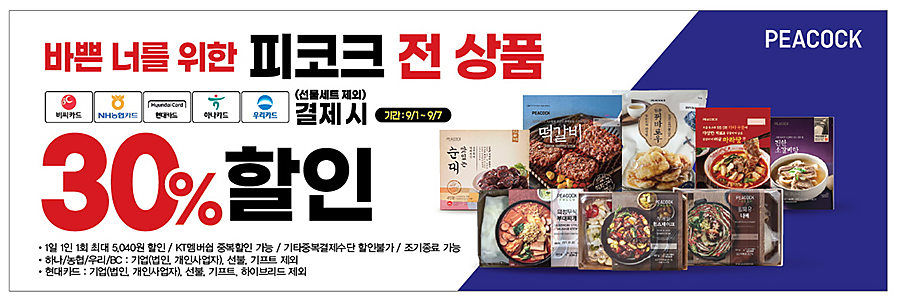 고객들은 1천원 까망베르쿠키부터 16800원짜리 부채살 찹스테이크까지 모든 피코크 상품을 30% 할인된 가격에 구매할 수 있는 기회다. (1일 1인 1회 최대 5040원 할인 가능, KT멤버십 중복 할인 가능)