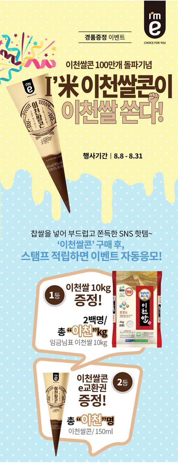 이마트24가 8일(목)부터 31일(토)까지 이천쌀콘 판매수량 100만개 돌파 기념 고객 감사 프로모션「I’米(아이미) 이천쌀콘이 이천쌀 쏜다!」를 진행한다.