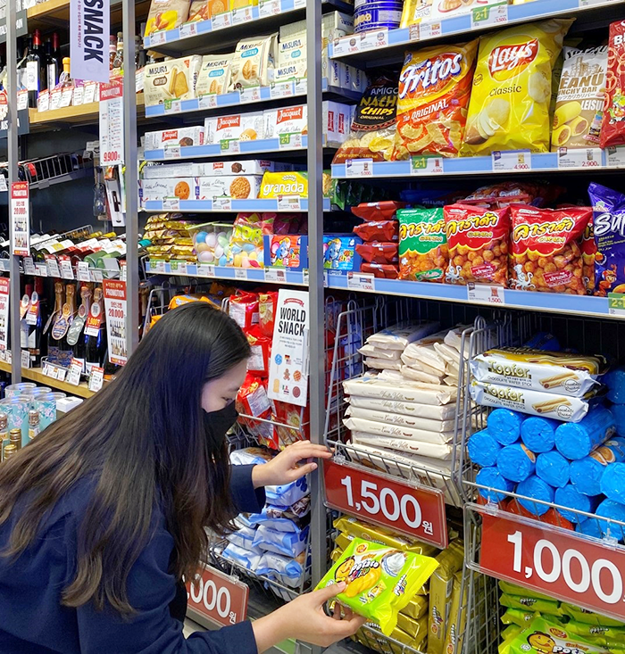 이마트24는 수입과자 특화매장 본격 확대에 앞서 작년 5월부터 올해 2월까지 판매데이터를 바탕으로 가성비, SNS 이슈 상품에 초점을 맞춰 리뉴얼을 진행했다. 이번 리뉴얼에서 가장 눈에 띄는 변화는 균일가 존이다. 특화매대 하단에 망선반을 설치해 1000원~1500원의 가성비 스낵을 모음진열했다. 수입과자 특화매장 전체 매출의 43%를 차지하고 있는 가성비 스낵에 대한 고객 주목도를 높인다는 계획이다.