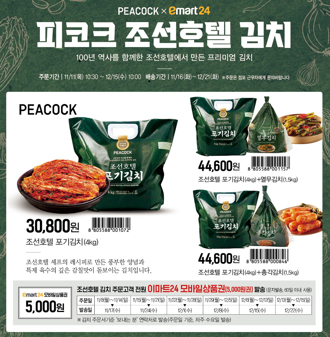 MEDIA 글자 크기 보통 크게 아주 크게 공유하기 페이스북 X 카카오톡 링크 복사 링크 복사됨 도구 보기 이미지 다운로드 이마트24, 김장철 맞아 ‘피코크 조선호텔 김치’ 주문 센터로 변신! 2021.11.09 이마트24