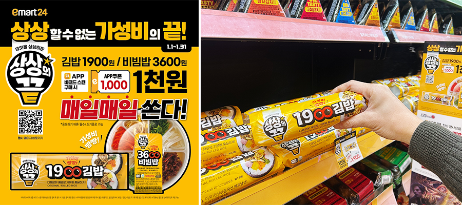 이마트24는 지속되는 고물가 시대에 고객들의 장바구니 부담을 줄이기 위해 초저가상품을 선보이는 ‘상상의끝’ 프로젝트를 펼친다. 그 첫번째 상품으로 김밥, 비빔밥을 이달 출시한다.