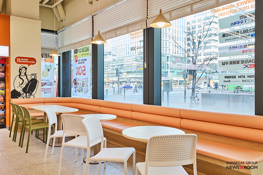 한 걸음 더 들어가면, 편의점 특유의 차가운 분위기가 옅어진다. 따뜻한 조명과 넓게 열린 동선이 이어지며 매장 전체가 자연스럽게 ‘머무르는 공간’으로 전환된다.