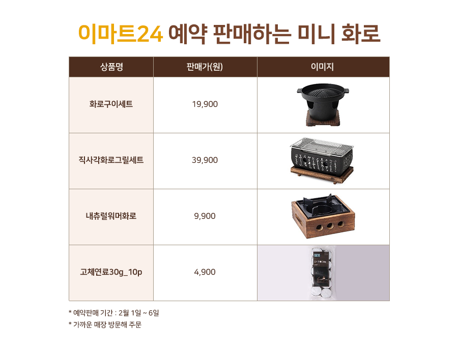 이마트24는 2월 1일(월)부터 6일(토)까지 미니 화로 3종, 고체연료 1종을 예약 판매한다.