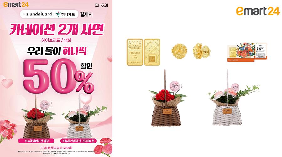 이마트24 서비스플랫폼팀 김시훤MD는 “어버이날, 스승의날 등 행사가 많은 가정의 달을 맞아 가까운 편의점에서 선물을 구입할 수 있도록 상품을 준비했다”며 “순금 카네이션, 골드바는 선물로서 의미와 소장가치, 투자가치가 있어 이번 어버이날을 맞아 마음을 전하기 위해 구매하는 고객이 많을 것으로 예상하고 있다”고 말했다.