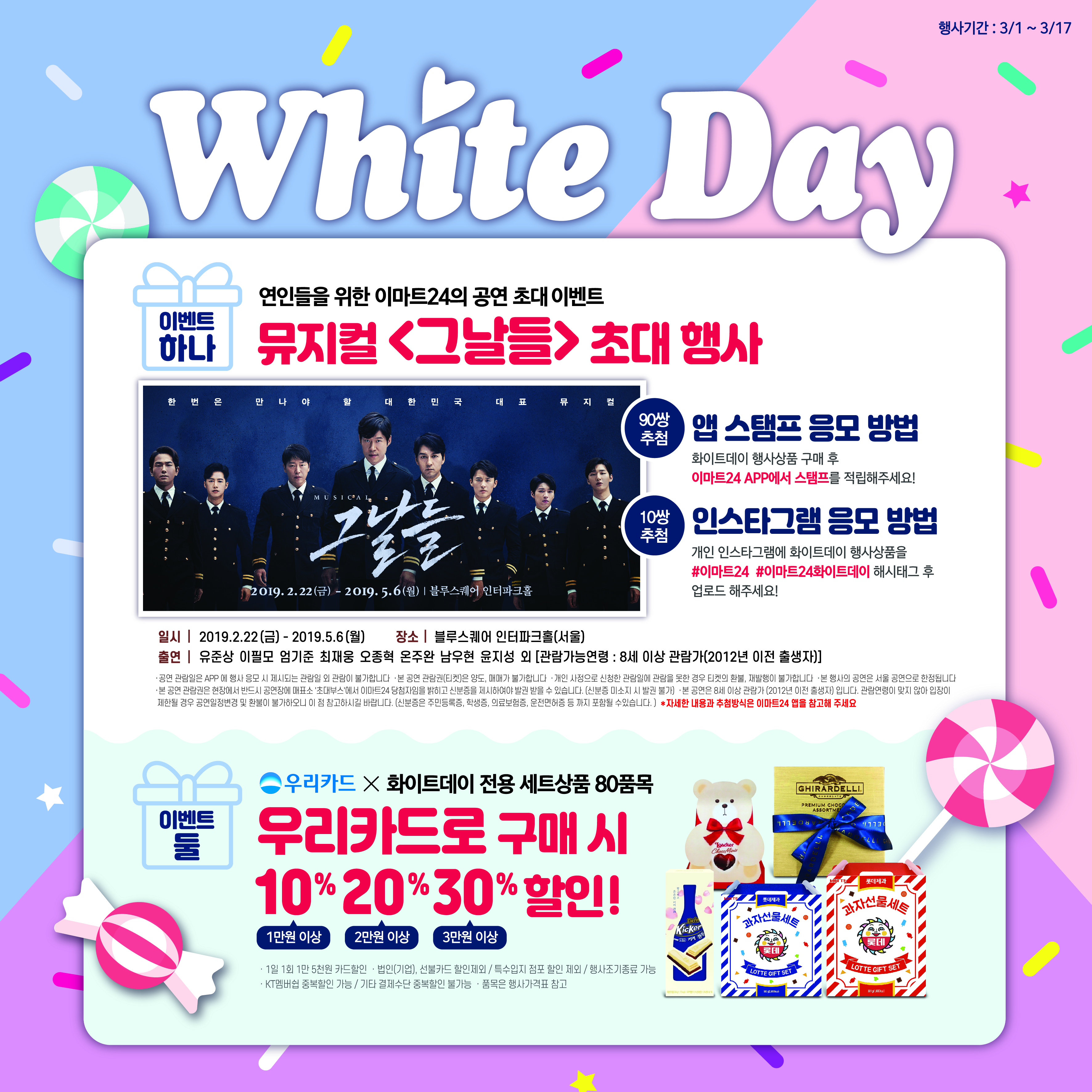 이마트24 화이트데이 정기행사 상품 구매 후, 모바일 앱 스탬프를 1회 이상 적립하거나 인스타그램 인증샷(#이마트24 #이마트24 화이트데이)을 남기면 자동 응모된다.