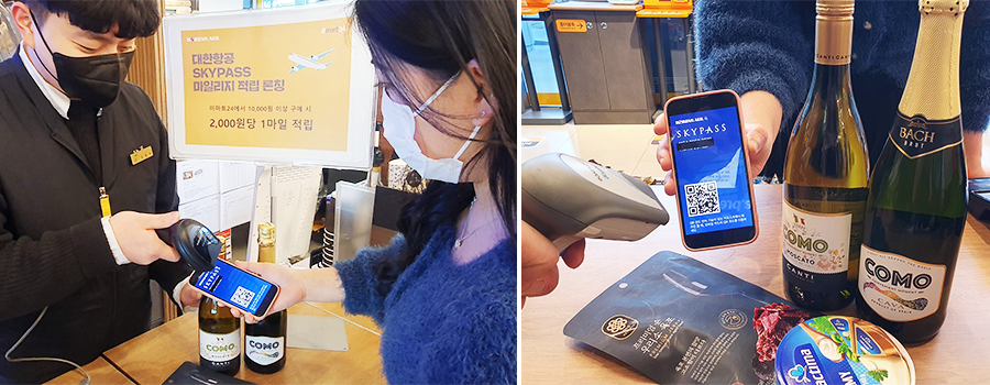 마일리지를 적립하기 위해서는 이마트24 매장에서 1만원 이상의 상품을 구입하면서, 대한항공 앱에 있는 스카이패스(SKYPASS) QR코드를 먼저 스캔 한 뒤, 결제하면 된다.