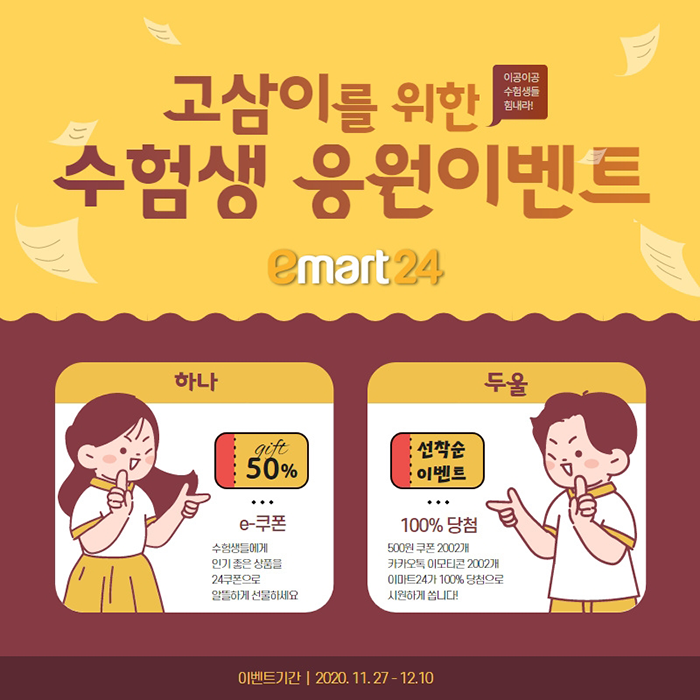 이마트24는 수능 다음날인 12월 4일부터 12월 10일까지 카카오톡 이모티콘 ‘테이스트오브서울2020’ 2002개 또는 이마트24에서 현금처럼 사용 가능한 500원 쿠폰 2002장을 선착순으로 증정하는 이벤트를 진행할 계획이다. 고3 수험생(2002년생)이면 누구나 이벤트에 참여 가능하다.
