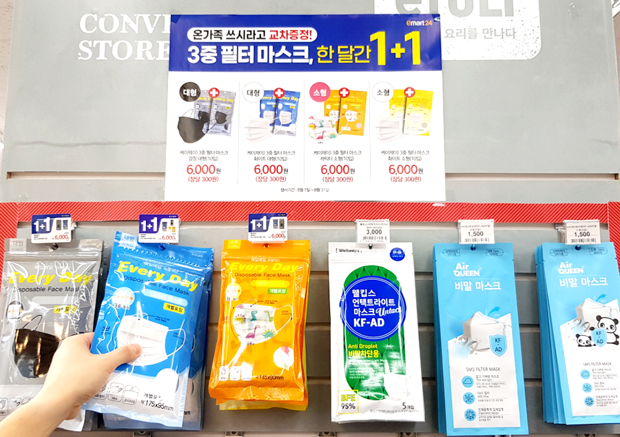 이마트24는 고객들의 호응에 힘입어 3중필터 1회용 마스크 1+1 행사를 소형까지 확대해서 이어가고 있다. 이마트24는 8월말까지 ‘에브리데이’ 3중필터 1회용 마스크 4종(백색/흑색/소형백색/소형캐릭터)에 대해 1+1 판매를 진행한다. 10입 6천원 상품을 1+1으로 판매함에 따라 고객들은 이마트24에서 개당 300원(2팩 20개 6천원)에 3중필터 1회용 마스크를 구매할 수 있다. 에브리데이 3중필터 1회용 마스크는 10입 포장 상품이지만 1장씩 개별 포장돼 있어 보다 위생적으로 사용할 수 있다.