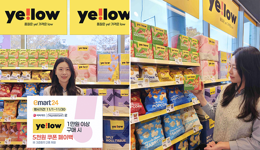 ‘옐로우(ye!low)’는 ‘품질은 ye! 가격은 low’라는 의미를 담은 이마트24의 새로운 PL(Private Label)브랜드로, 지난달 초 선보인 이후 높은 가심비로 고객들의 큰 호응을 얻고 있다. 실제로 ‘옐로우’ 상품 10월 매출은 전년 동기 대비 기존 PL 상품과 비교했을 때 15% 이상 성장하며 빠르게 안착한 것으로 나타났다.