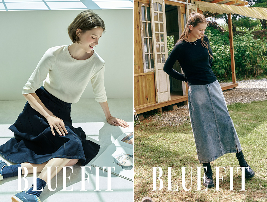 블루핏 데님 스커트는 깔끔하게 떨어지는 H라인과 은은한 빈티지 워싱으로 세련된 실루엣을 완성한다. 함께 출시된 리브 티셔츠는 7부 소매와 프리미엄 소재를 사용해 편안하면서도 고급스러운 착용감을 선사한다.
