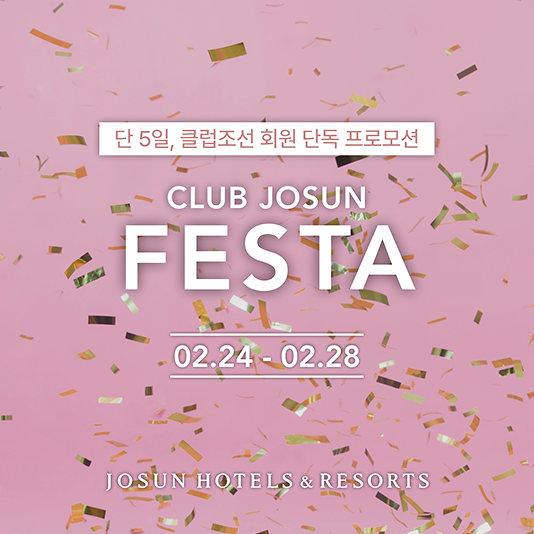 조선호텔앤리조트, 클럽조선 멤버십 회원 대상 프로모션 ‘클럽조선 페스타’ 진행조선호텔앤리조트가 ‘클럽조선(Club Josun)’ 멤버십 회원 대상으로 봄을 맞이하여 재충전의 시간과 다채로운 미식을 즐길 수 있도록 객실 및 레스토랑, 공식 온라인몰까지 다양한 혜택을 누릴 수 있는 ‘클럽조선 페스타(Club Josun Festa)’를 2월 24일(월)부터 2월 28일(금)까지 선보인다.