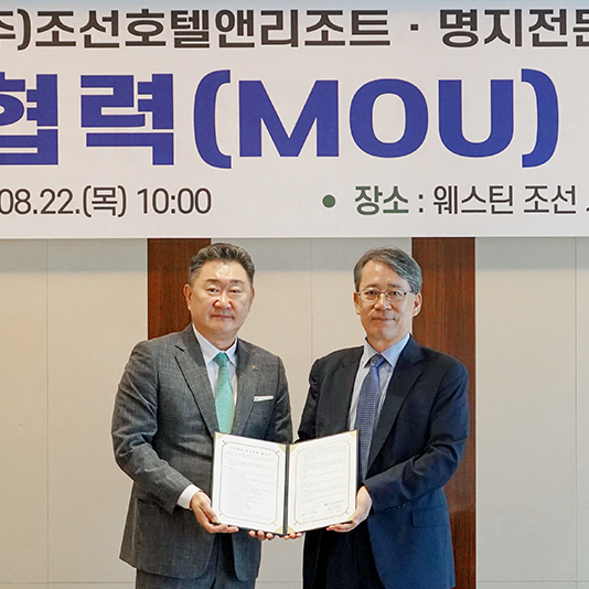 조선호텔앤리조트 X 명지전문대학, 호스피탈리티 산업 전문가 양성을 위한 업무 협약 체결조선호텔앤리조트(대표이사 이주희)와 명지전문대학(총장 권두승)이 호스피탈리티 산업 전문 인력 양성을 위한 업무협약을 체결했다.