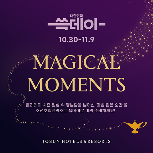 조선호텔의 쓱데이 매직! 조선호텔앤리조트, ‘2025 대한민국 쓱데이’ 참여조선호텔앤리조트가 10월 30일(목)부터 11월 9일(일)까지 진행되는 ‘2025 대한민국 쓱데이’에 객실, 레스토랑, 웨딩을 비롯해 리테일, 멤버십, 레저 상품 등 다채로운 혜택이 적용된 360여종의 풍성한 상품들을 선보인다. 이번 행사에서 조선호텔앤리조트는 ‘매지컬 모먼트(Magical Moment)’라는 테마를 담아 휴식과 미식, 라이프스타일까지 평범한 일상 속에서 만나는