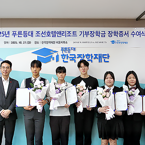 조선호텔앤리조트, 관광특성화 인재 육성 위한 ‘2025 푸른등대 기부장학금 장학증서’ 수여조선호텔앤리조트(대표이사 최훈학)와 한국장학재단(이사장 배병일)이 10월 27일(월), 서울시 중구 한국장학재단 서울사무소에서 ‘2025년 푸른등대 조선호텔앤리조트 기부장학금 장학증서 수여식’을 개최했다. 2023년 한국장학재단과 업무협약(MOU) 체결 후 3년째 이어지는 조선호텔앤리조트의 장학증서 수여식은 호텔 관련 학과(호텔, 관광, 조리, 제과/제빵, 경영, 서비스학과)를 둔 전국 관광 특성화고 재학생