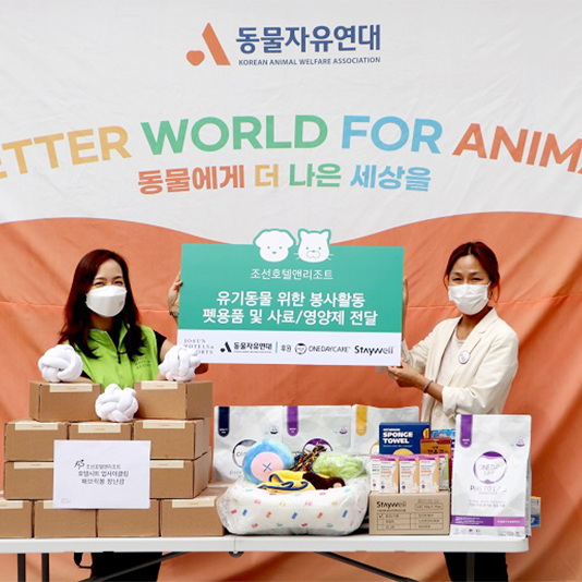 조선호텔앤리조트, 유기동물 위한 사회공헌 활동 진행조선호텔앤리조트가 유기동물을 위한 사회공헌활동의 일환으로 임직원들의 봉사활동을 진행하고 펫용품 전달식을 9월 15일(목) 오후 경기도 남양주에 위치한 동물자유연대 온센터에서 진행했다.