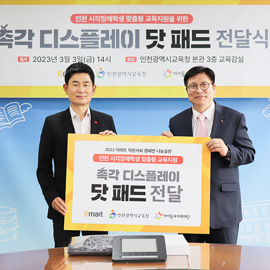 이마트, 1억원 상당의 시각장애인용 점자 패드 기부이마트가 시각장애인들의 교육환경 개선을 위해 1억원 상당의 점자 패드를 기부한다.