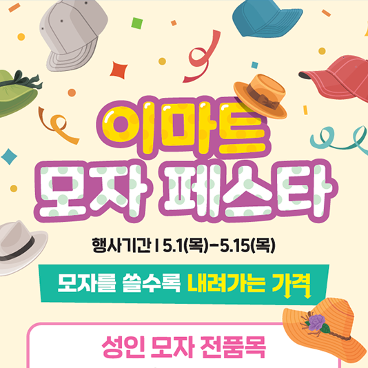 모자 종류만 1천여개! 이마트, 역대 최초 ‘모자 페스타’ 개최이마트가 5/15일(목)까지 약 1천여종의 모자를 최대 50% 할인하는 ‘모자 페스타’를 진행한다.