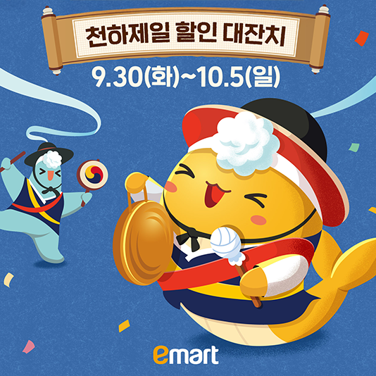 전국에서 펼쳐지는 천하제일 할인 ‘大’잔치, 이마트, 10월 ‘고래잇 페스타’ 개막초특가에 북을 울려라! 춤이 절로 나오는 할인 대잔치가 시작된다 이마트가 9/30일(화)부터 10/5일(일)까지 6일간 ‘10월 고래잇 페스타’를 선보인다. 이번 행사의 컨셉은 ‘천하제일 할인 대잔치’로, 이마트는 신선식품부터 가공식품, 생활용품, 가전제품까지 전방위적인 초저가 할인을 펼쳐 추석 연휴 장바구니 물가 안정에 큰 도움을 드리겠다는 계획이다. ‘고래잇