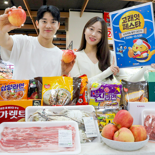 “명절 먹거리는 반값! 재미와 혜택 잡은 골라담기까지!” 이마트 천하제일 할인 대잔치, 10월 ‘고래잇 페스타’이마트가 명절 물가 안정을 위한 대대적인 할인 행사에 나선다. 이마트가 9/30(화)부터 10/5(일)까지 6일간 ‘10월 고래잇 페스타’를 선보인다. 이마트는 삼겹살/사과/감귤/꽃게/킹크랩/꽃갈비 등 추석 인기상품을 초특가에 선보인다. 9/30(화)-10/1(수) 2일간 가을 햇 보조개 사과(4-8입)를 6,980원에 판매한다. 또, 해당기간 국내산 삼겹살/목심을 행사카드 전액 결제시 50%