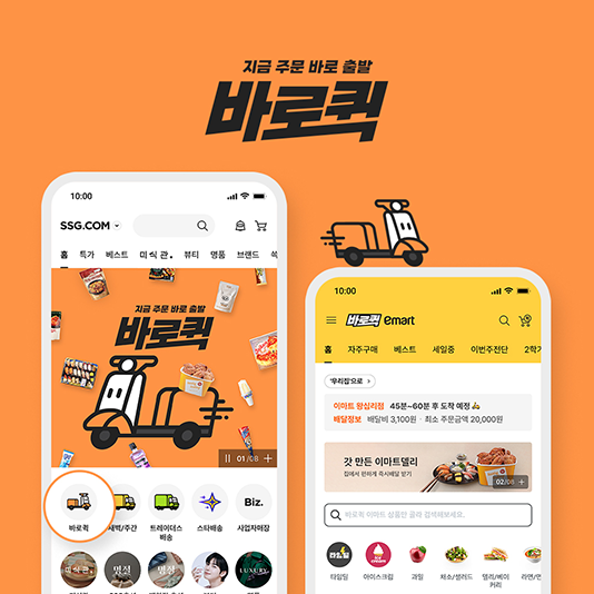“피코크·5K PRICE 상품도 주문하면 1시간내 도착” SSG닷컴, 퀵커머스 서비스 ‘바로퀵’ 론칭SSG닷컴이 앱에서 이마트 상품을 주문하면 도착지까지 1시간 내로 배송하는 ‘바로퀵’ 서비스를 내달 1일부터 시작한다고 28일 밝혔다. 오는 9월 1일부터 수도권과 충청·대구·부산 등 지방에 위치한 이마트 19개 점포에서 즉시 배송 서비스를 개시하며, 향후 전국 단위로 확대할 계획이다. 서울권 이마트 왕십리점·마포점·은평점·월계점·하월곡점·자양점·목동점·신월점·구로점·역삼점·천호점·가든5점과 경기권 이마트 동탄점·수원점·서수원점, 충청권 이마트 천안점·천안터미널점, 대구권 이마트 수성점, 부산권 이마트