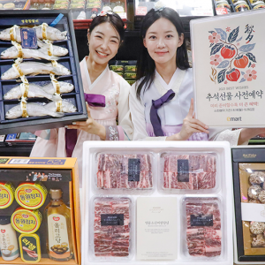 이마트, 추석 선물세트 사전예약 시작!8월 19일 화요일 오전 이마트 용산점에서 모델들이 사전예약에 돌입한 이마트 추석 선물세트를 소개하고 있다. 이마트는 9월 26일(금)까지 추석 사전예약 프로모션을 진행한다. 이 기간동안 행사카드로 선물세트를 구매하면 상품별로 최대 50% 할인되며, 구매 금액대별로 최대 150만원의 신세계상품권을 증정한다. 이마트 추석 선물세트는 SSG닷컴