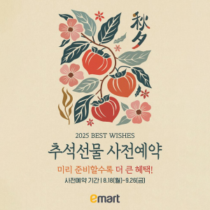 “긴 연휴, 더 커진 얼리버드 혜택” 이마트, 18일부터 추석 선물세트 사전예약 시작이마트가 2025년 추석 선물세트 사전예약을 시작한다. 이마트는 8월 18일(월)부터 9월 26일(금)까지 총 40일간 추석 사전예약 프로모션을 진행한다. 이 기간동안 행사카드로 선물세트를 구매하면 상품별로 최대 50% 할인되며, 구매 금액대별로 최대 150만원의 신세계상품권을 증정한다. 이마트 추석 선물세트는 SSG닷컴 이마트몰에서도 구매 가능하다. ※ 행사카드:
