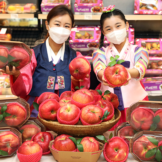 이마트, 상위 1% 왕특과 제수용 홍로 사과 한정 판매이마트는 오는 22일(수)까지 6천팩 한정으로 ‘제수용 홍로 사과(왕특과, 550g 내외, 2입)’를 1만 4,900원에 판매한다. 일반적으로 판매되는 사과의 경우 평균 330g 내외이며, 추석 선물세트에 들어가는 큰 사과 역시 최대 450g 수준에 불과하다. 이마트는 제수용 사과의 경우 사과의 크기가 큰 것을 선호한다는 점에서 착안해 장수, 거창 등의 고산지 농가에서 직접 매입한 550g 내외의 상위 1% 왕특과 사과를 한정 물량으로 선보인다.