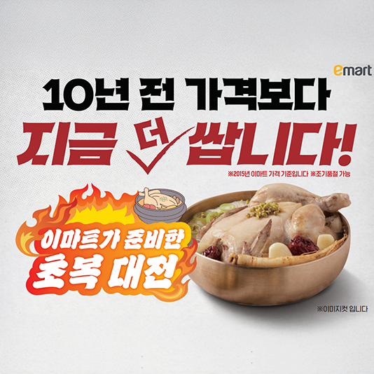 10년전 초복 행사 가격보다도 ‘더’ 내렸습니다… 이마트, 역대급 초복 행사 펼친다이마트가 10년전 초복 행사보다 ‘더’ 내린 가격으로 고객에게 찾아간다.