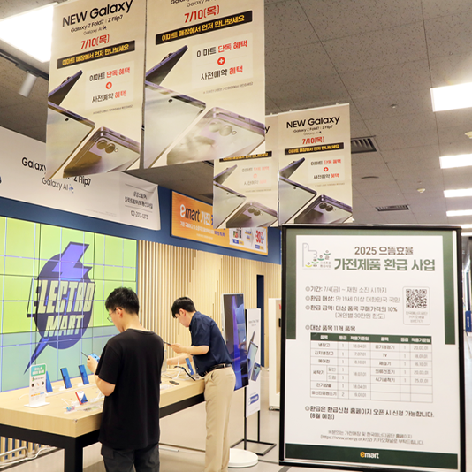 “새로운 갤럭시Z, 이마트 매장에서 만나세요!” 이마트 스마트폰, 대형가전 할인 행사이마트는 스마트폰을 비롯해 대형, 소형가전을 구매하는 고객에게 대대적인 혜택을 제공한다.