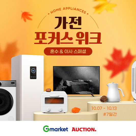 G마켓, ‘가전 포커스위크’ 진행… 인기 가전 최대 반값 할인신세계그룹 계열 이커머스 G마켓과 옥션이 13일까지 ‘가전 포커스위크’를 열고, 가을 혼수, 이사 시즌 필수 가전을 할인 판매한다.