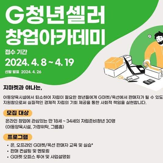 G마켓, 자립준비청년 ‘경제적 홀로서기’ 돕는다… 셀러 육성 프로그램 운영G마켓이 홀로서기를 준비하는 자립준비청년을 지원하기 위한 ‘G청년셀러 창업아카데미’를 진행한다. 취업난으로 어려움을 겪는 자립준비청년이 이커머스 판매자로 성장해 독립할 수 있도록 전폭 지원할 방침이다.