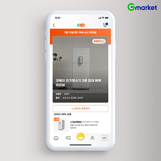 G마켓, 11일 코웨이 정수기 3종∙비렉스 페블체어 라이브방송국내 대표 온라인 마켓플레이스 G마켓이 11일(목) 저녁 6시부터 1시간 동안 ‘코웨이 라이브방송’을 진행하고, 인기 렌탈 상품을 할인가에 소개한다. 최대 30만원 스마일캐시 등 방송 전용 혜택도 풍성하게 선보인다.