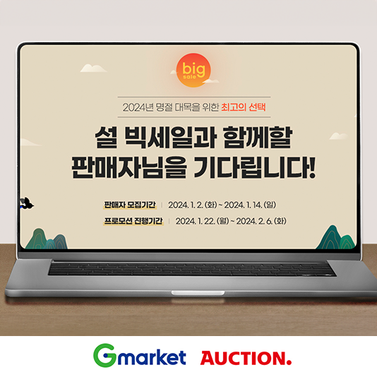 G마켓, 14일까지 ‘설 빅세일’ 참여 셀러 모집국내 대표 온라인 마켓플레이스 G마켓이 오는 14일까지 ‘설 빅세일’에 참여할 판매고객을 모집한다. 물류보관비 및 AI 광고체험 등 다양한 판매지원책도 제공한다. 행사는 1월 22일부터 2월 6일까지 열린다.