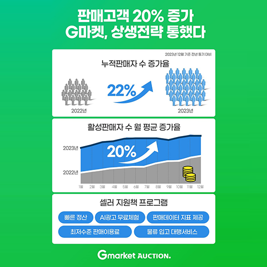G마켓, 중소셀러 상생전략 통했다… 판매자수 20% 증가2024.01.16 -