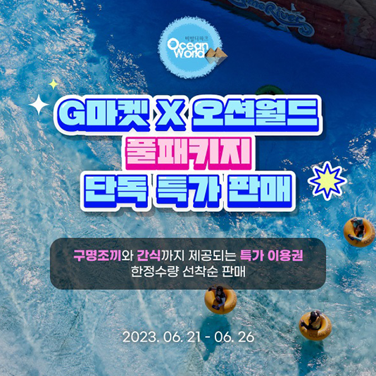 G마켓, “성수기 티켓 첫 특가”… 오션월드 풀패키지 단독 판매국내 대표 온라인 마켓플레이스 G마켓이 오는 21일부터 26일까지 6일 간 ‘오션월드 풀패키지’를 단독 특가에 판매한다.