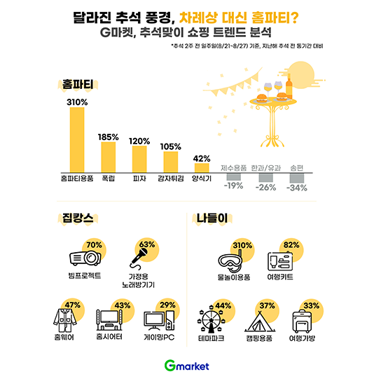 G마켓, ‘차례상 대신 홈파티’…추석 쇼핑 트렌드 분석추석 풍경이 달라지고 있다. 차례나 성묘는 간소화하는 대신, 홈파티와 나들이를 즐기는 등 팬데믹을 겪으면서 명절 풍경이 빠르게 변모하고 있다.