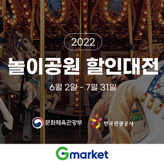G마켓, ‘놀이공원 할인대전’ 동참G마켓이 내달 31일까지 문화체육관광부와 한국관광공사가 주최하는 ‘2022 놀이공원 할인대전’에 참여한다. 사회적 거리두기 해제로 야외활동 인구가 폭발함에 따라 놀이동산, 워터파크 등 전국 78개 유원시설을 대상으로 할인 혜택을 제공하고, G마켓 단독 할인 혜택까지 준비했다.