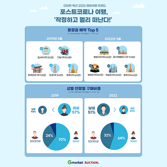 지마켓글로벌, “여행도 보복소비, 작정하고 떠난다” G마켓·옥션, 해외항공권 9배 급증… 즉흥여행 줄고 장거리·계획여행 인기코로나19로 닫혔던 하늘 길이 열리면서 해외여행 수요가 꿈틀대는 가운데, 가까운 주변 국가 보다 상대적으로 비행시간이 긴 장거리 여행지를 택하는 수요가 폭발적으로 증가하고 있다.