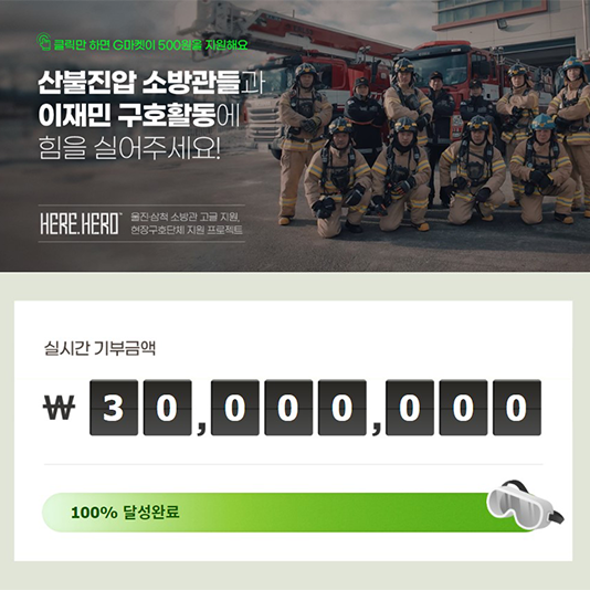 G마켓, 울진•삼척 기부 캠페인 ‘히어히어로’ 성료국내 대표 온라인 마켓플레이스 G마켓이 울진•삼척 소방관 및 현장구호단체 지원을 위해 전개한 ‘히어히어로(Here, Hero)’ 캠페인이 고객들의 뜨거운 호응에 힘입어 1주 만에 목표 금액 3천만원 모금을 조기 달성하고, 물품 및 지원금 전달까지 완료했다.