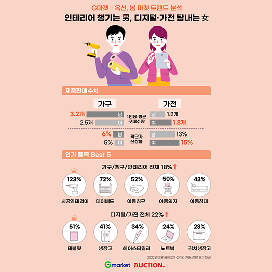 지마켓글로벌, ‘봄 쇼핑 동상이몽’… 인테리어 챙기는 男, 디지털·가전 탐내는 女2022.02.21 -