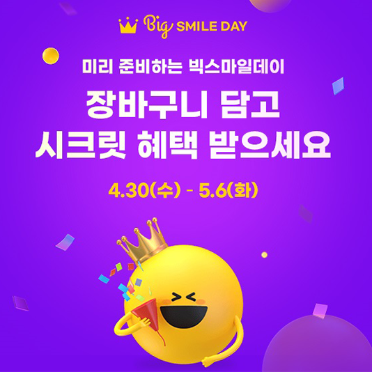 “갖고 싶은 상품 미리 담으면, 깜짝 추가 할인” G마켓, 빅스마일데이 사전행사에 ‘시크릿쿠폰’ 푼다신세계그룹 계열 이커머스 G마켓과 옥션이 다음달 상반기 최대 쇼핑축제 ‘빅스마일데이’를 앞두고 얼리쇼핑족을 위한 사전행사를 진행한다.