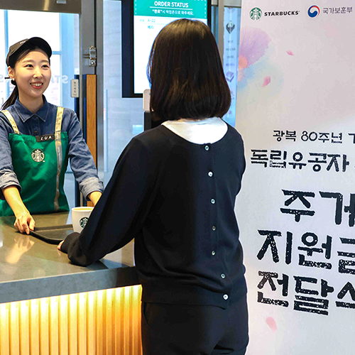 “순국선열의 숭고한 노력과 헌신을 기억합니다” 스타벅스, 독립유공자 후손 주거지원금 전달스타벅스 코리아(대표이사 손정현)가 독립문역점과 환구단점의 8월 한 달간 수익금 전액을 독립유공자 후손의 주거지원금으로 특별 기부했다. 스타벅스는 순국선열의 날을 앞둔 지난 14일 스타벅스 독립문역점에서 전달식을 갖고, 한국사회복지협의회를 통해 생계가 어려운 독립유공자 후손에게 기부금을 전달했다. 이 날 전달식은 김지영 스타벅스 코리아 ESG팀 팀장, 김상희 국가보훈부 생활안정과 과장, 김민우