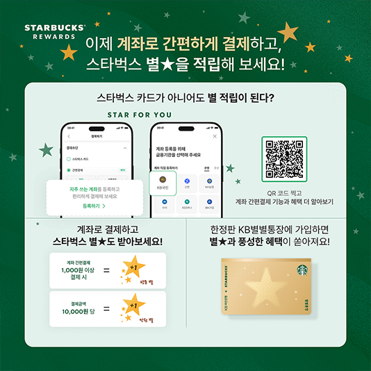 스타벅스, KB국민은행과 함께 ‘계좌 간편결제’로 새로운 결제 시대 연다!스타벅스 코리아(대표이사 손정현)가 KB국민은행(은행장 이환주)과 협력해 4월 1일부터 공식 애플리케이션에 오픈뱅킹을 기반으로 한 ‘계좌 간편결제’를 신규 결제 수단으로 도입한다.