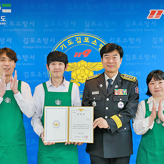 스타벅스 풍무역DT점 파트너, 현장 응급상황 대처 공로로 김포소방서장상 수상스타벅스 코리아(대표이사 손정현) 풍무역DT점 파트너들이 3월 6일 김포소방서(서장 유해공)에서 현장 응급상황 대처 공로를 인정받는 김포소방서장 유공 표창을 받았다.