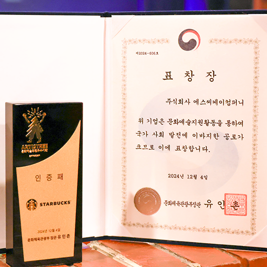 스타벅스, 문화예술후원 우수기관 인증제도에서 문화체육관광부 장관상 영예스타벅스 코리아가 올해로 10주년을 맞이한 ‘2024 문화예술후원 매개단체 및 우수기관 인증제도’에서 문화체육관광부 장관상 수상과 문화예술후원 우수기관 재인증을 받았다.